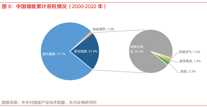 抽水蓄能和電化學(xué)儲能是目前主流的傳統(tǒng)儲能和新型儲能形式。目前,各類儲能方案主要可以分為熱儲能、機械儲能、電化學(xué)儲能、電磁儲能以及化學(xué)儲能等幾大類。其中機械儲能中的抽水蓄能是當前最主要的傳統(tǒng)儲能方式,占到中國儲能裝機總量的 77%,在新型儲能中鋰離子電池是當前最主要的方案,占到了新型儲能裝機的 94%左右。