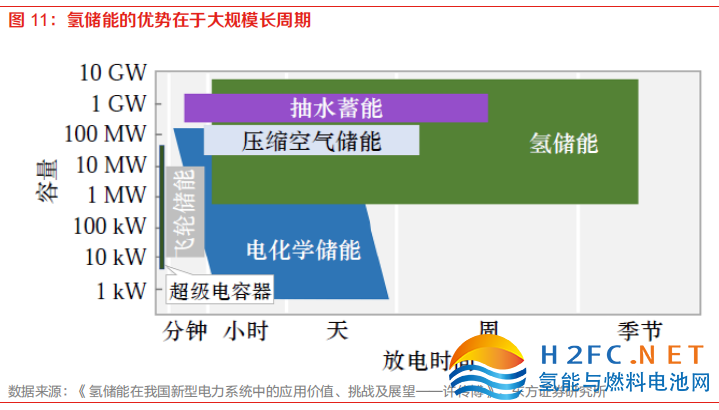 而氫儲能則是一種更適合于長周期大規(guī)模場景的儲能方式,可以實現(xiàn)跨季節(jié)的儲能,這一方面得益于相比于電池的自放電、水的蒸發(fā)耗散,氫作為一種穩(wěn)定的化學(xué)品更適合長時間的儲存,因而更適合跨季節(jié)的長周期儲能,另一方面,氫儲能在大規(guī)模的儲能場景下也更具經(jīng)濟優(yōu)勢,氫儲能的制儲部分主要由制氫系統(tǒng)(功率)和儲氫系統(tǒng)(容量)分別構(gòu)成,可以實現(xiàn)儲能功率與儲能容量的解耦,因而在長時間、大規(guī)模的儲能場景下,氫儲能容量的增加主要依靠擴大儲氫系統(tǒng)的容量,可以實現(xiàn)更低的規(guī)模化成本;相比電化學(xué)儲能受到蓄電池原理的約束,功率和容量耦合,在大規(guī)模儲能的場景下規(guī)模化降本的潛力較小,所需的成本較高。有研究表明,規(guī)模化儲氫比規(guī)模化儲電的成本要低一個數(shù)量級。