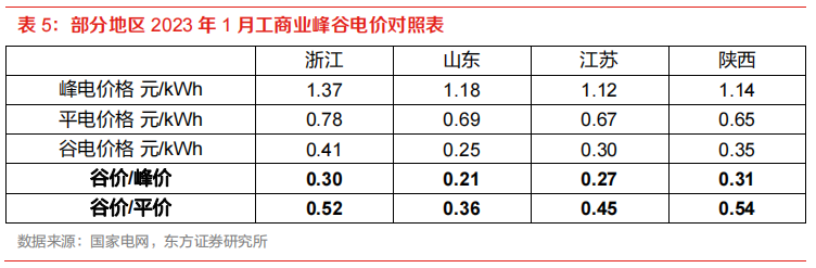 以目前各地區(qū)的峰谷電價為例,如浙江、山東、江蘇、陜西等地的谷電價格僅為平時電價的 1/2左右,峰時電價的 1/3 左右。價差最大的山東,其谷時電價僅為平時電價的 1/3,峰時電價的 1/5。