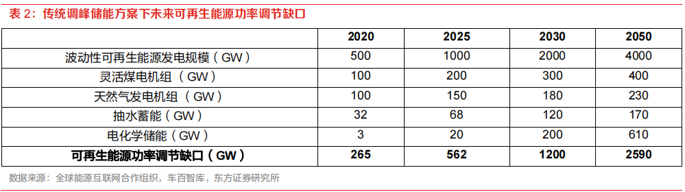 在當前儲能方案下,未來還存在大量的可再生能源功率調(diào)節(jié)缺口。根據(jù)全球能源互聯(lián)網(wǎng)合作組織的預(yù)測,隨著未來非水可再生能源裝機規(guī)模的增長,我國的電力系統(tǒng)將產(chǎn)生巨大的功率調(diào)節(jié)缺口,缺口主要來自于三個方面:第一,靈活性煤電機組、天然氣發(fā)電機組作為化石能源發(fā)電方式,在碳中和的目標下規(guī)模受到限制;第二,抽水蓄能受限于地理條件等因素,發(fā)展規(guī)模具有上限;第三,電化學(xué)儲能是目前快速發(fā)展的新型儲能方式,但在長周期、大規(guī)模儲能需求的應(yīng)用上仍然面臨著鋰資源約束、成本偏高、安全性等問題。