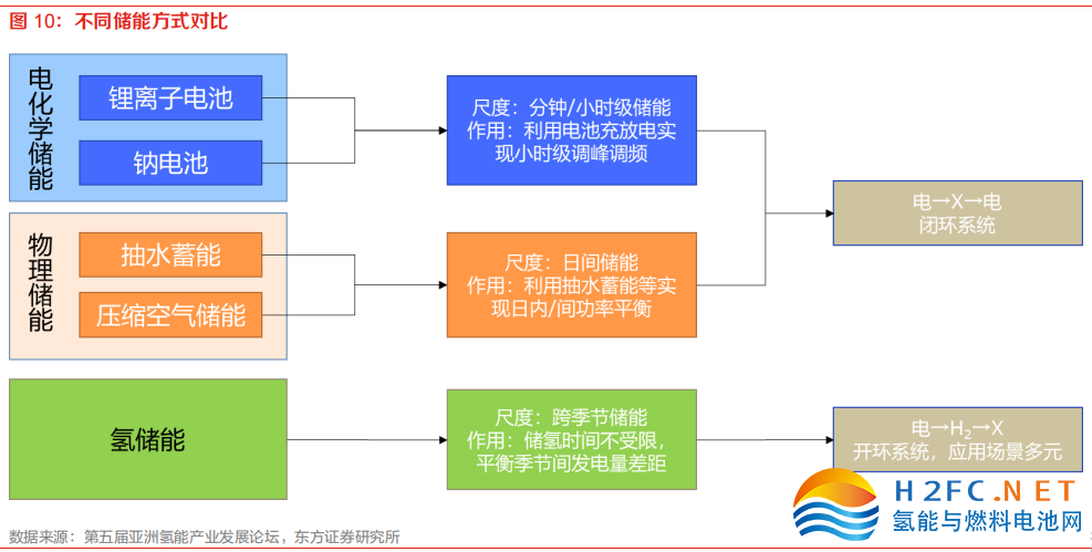 從應(yīng)用場景上來看,其他儲能方式一般為電→X→電的閉環(huán)系統(tǒng),也即最終能源還需要以電力的形式進行輸出。而氫作為一種燃料和化工原料,在下游有豐富的應(yīng)用場景,可以實現(xiàn)電→H2→X的開環(huán)儲能模式,也即由電制取的氫可以直接面向不同場景進行應(yīng)用,具有更高的場景靈活性,也可以避免更多的轉(zhuǎn)換環(huán)節(jié)以提高儲能效率。
