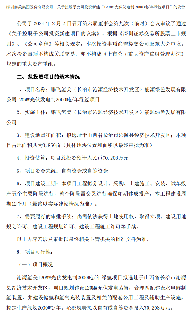 公告稱,根據赫美集團戰略及業務發展需要,公司控股子公司鵬飛氫美(長治市沁源經濟技術開發區)能源綠色發展有限公司(以下簡稱“沁源氫美”)擬投資新建“120MW 光伏發電制2000噸/年綠氫項目”,項目投資總額預計約為70,208萬元,資金來源為自有資金或自籌資金。