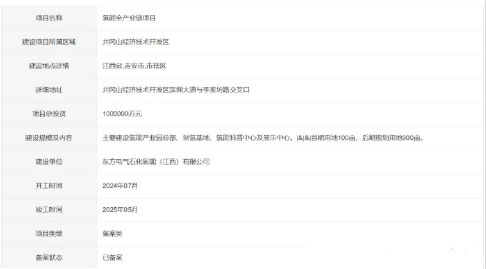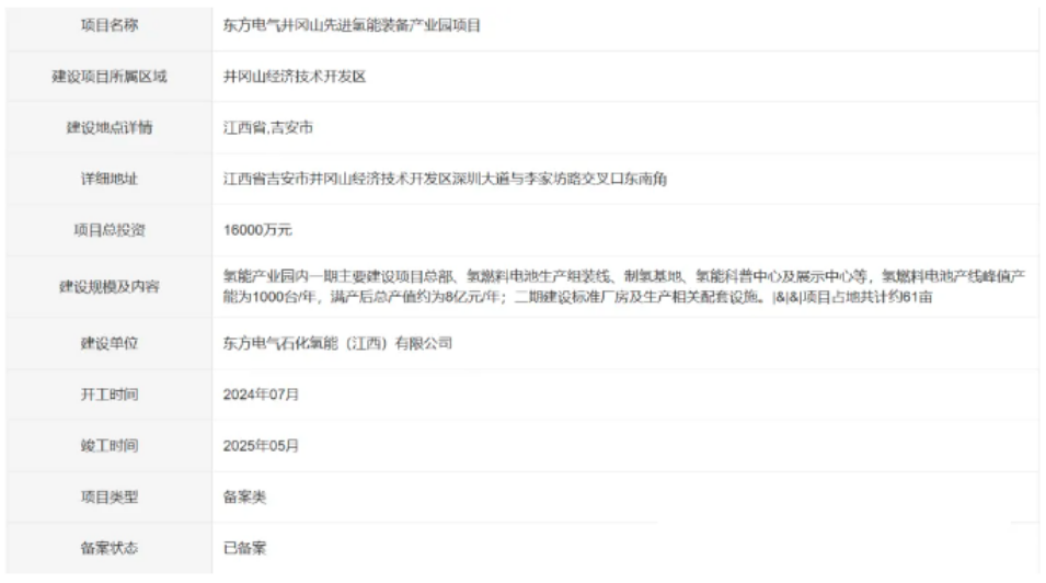 2024年4月16日,東方電氣石化氫能(江西)有限公司氫能全產業鏈項目正式獲備案。