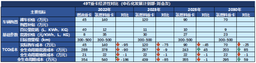 在最近的電動汽車百人會上,中石化的劉會友,展示了一張氫能重卡的經濟性測算表。香橙會也有類似的測算,結果大差不差。結論都是,目前氫燃料重卡,處在一個微妙的盈虧平衡點上。從5年全生命周期的角度,已經跟燃油重卡打平。但是,從終端使用者的角度,目前還沒有感受到。這個時候,需要政策往前推一把。