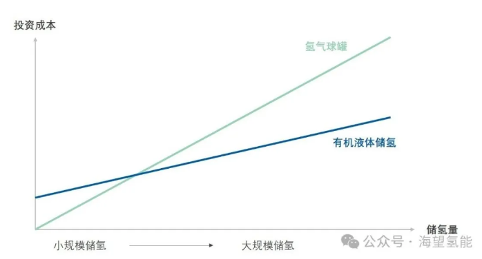 圖:有機液體儲氫系統與氣態球罐儲氫成本對比:大規模時具備優勢