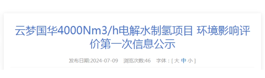 7月9日,云夢國華4000Nm3/h電解水制氫項目環境影響評價第一次公示。