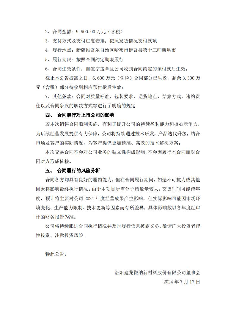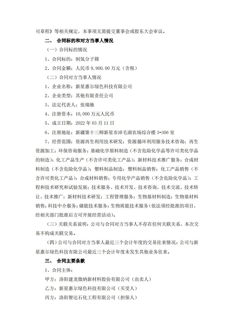 該公告內容明確指出:洛陽建龍微納新材料股份有限公司于近日與新星惠爾綠色科技有限公司簽訂了買賣合同,合同總金額為人民幣 9,900.00萬元(含稅),合同標的物:制氫分子篩,合同生效條件:自簽字蓋章且公司收到合同約定的預付款后生效。目前 6,600萬元(含稅)合同部分已生效,剩余 3,300 萬元(含稅)部分待收到相應預付款后生效。