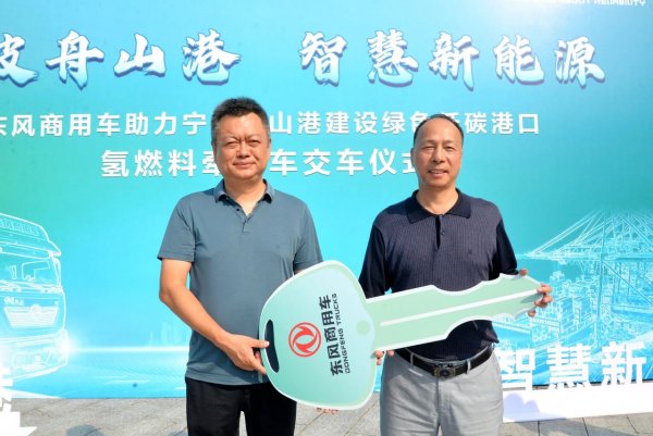 8月22日,東風商用車助力寧波舟山港建設綠色低碳港口氫燃料牽引車交車儀式在東風商用車品牌體驗中心舉行。10輛東風氫燃料牽引車鑰匙,由東風商用車新事業領域總監黃紹軍交付寧波舟山港集團技信部副主任馮華龍手中。