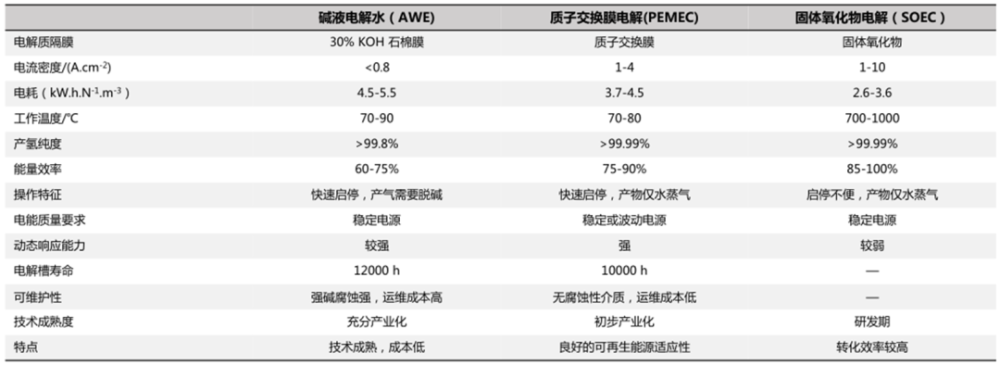 電解水制氫三種技術路線對比