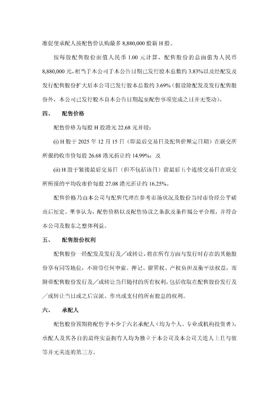 配售股份將根據(jù)一般性授權(quán)配發(fā)及發(fā)行,據(jù)此,董事獲授權(quán)配發(fā)及發(fā)行最多46,330,416股新H股,占本公司于2025年12月15日舉行臨時股東會日期已發(fā)行股份總數(shù)之20%。
