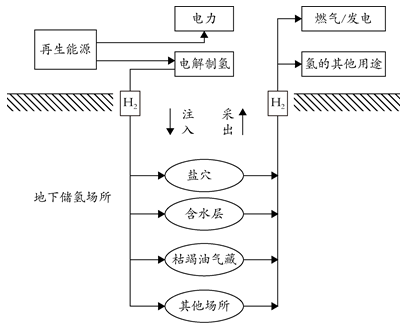 通過可再生能源發電并制取氫氣;將氫氣注入鹽穴、枯竭油氣藏、含水層和襯砌的硬巖洞等地下地質構造中;實現氫能的儲存;有需要時可將氫氣從地下儲氫場所采出用于燃氣、發電或其他用途。