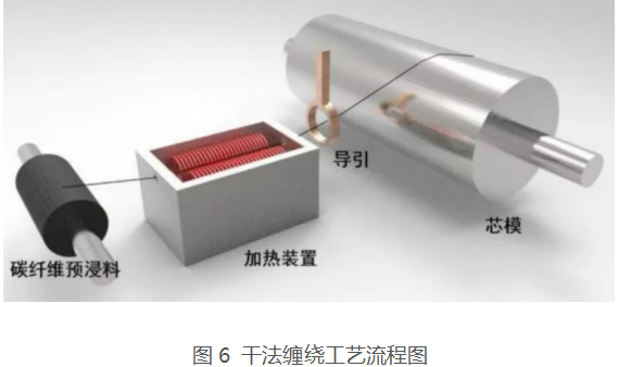 干法纏繞工藝以經(jīng)過(guò)預(yù)浸膠處理的預(yù)浸帶為原料,在纏繞機(jī)上經(jīng)加熱軟化至粘流態(tài)后纏繞到芯模上。其優(yōu)點(diǎn)主要有: