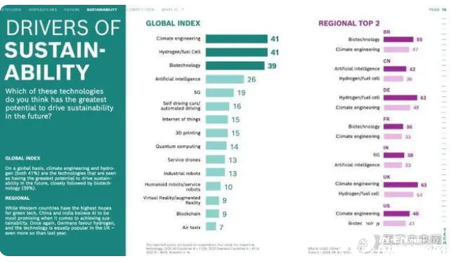 此外,該研究發現,全球有33%的人認為氫氣和燃料電池將對社會做出"特別積極"的貢獻,僅次于生物技術和氣候工程,分別為37%和36%。