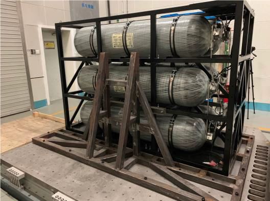 如圖3所示,這是一款由捷氫科技為匹配某款18T物流車設計的車載儲氫系統,壓力等級為35MPa。完全依據仿真的條件進行試驗,經過±X、±Y、±Z六個方向8個g的加載沖擊后,檢查氫系統的變化,滿足GB/T 26990-2011《燃料電池電動汽車車載氫系統技術條件》、GB/T 29126-2012《燃料電池電動汽車 車載氫系統試驗方法》要求。同時試驗后的氫系統做了一輪常規的保壓測試,確保了沖擊后的氫系統沒有發生泄露。