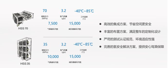 目前,捷氫科技自主開發的車載儲氫系統涵蓋了35MPa和70MPa兩種壓力等級,分別為HSS 35與HSS 70兩種系列。從零件級別到系統級別都做高度集成設計,可以靈活匹配各種車型,包括乘用車、公交客車、輕型卡車、重型卡車、叉車等。儲氫量可以根據整車需求,通過增減氫瓶數量進行匹配。圖5為捷氫科技部分燃料電池車載儲氫系統產品。