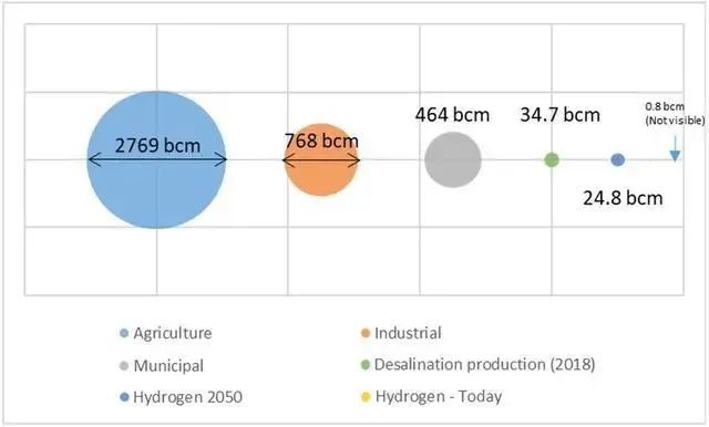 即使電解氫能滿足整個2050年的氫需求,用水量也將約為250億立方米。下圖將這個數字與其他人為的水消耗流進行了對比。農業用水是2800億立方米中最大的,工業用水接近8000億立方米,城市用水4700億立方米。目前天然氣重整和煤氣化制氫的用水量約為15億立方米。