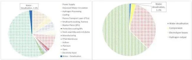 看看海水淡化的能源消耗,與電解槽輸入所需的電力相比,這也是非常小的。目前運行的反滲透裝置耗電量約為3.0千瓦/立方米。相比之下,熱力脫鹽廠的能耗要高得多,從40到80千瓦時/立方米不等,額外的電能需求為2.5到5千瓦時/立方米,這取決于脫鹽技術。以熱電廠的保守情況(即較高的能源需求)為例,假設使用熱泵,能源需求將轉化為約0.7kWh/kg的氫。從這個角度來看,電解槽的電力需求約為50-55kWh/kg,所以即使在最壞的情況下,脫鹽的能源需求約為系統總能量輸入的1%。