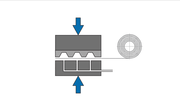 帶材清理后,便會進行成型和分割,生產(chǎn)出陰極板和陽極板。各雙極板廠商的成型方式和流程可能會有所不同,如下圖使用的是沖壓成型方式。