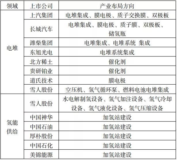 大型企業集團進入燃料電池核心零部件產業,憑借資金實力和渠道優勢以及大規模的研發和產業投入,加速了產業鏈的構建和集聚,加快了燃料電池汽車國產重要部件性能提升和規模化生產的時間表。國內部分燃料電池汽車相關上市企業及產業布局方向如下表所示。