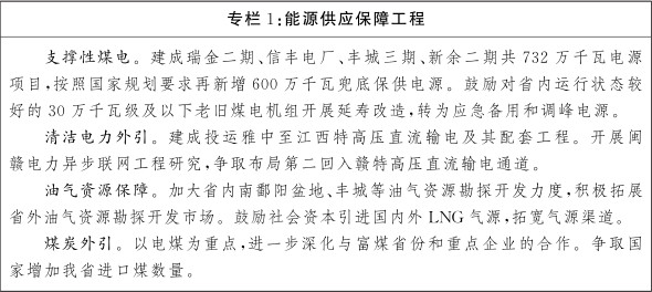?。ㄒ唬┕┙o能力穩(wěn)步提升。省內(nèi)產(chǎn)能結(jié)構(gòu)加速優(yōu)化,調(diào)運能力大幅提升,能源供應(yīng)保障基本充足。浩吉鐵路按期投產(chǎn),鐵路煤炭運力進(jìn)一步提高,水路煤炭運量由2015年的1984萬噸大幅提高到2020年的4154萬噸。2020年全省電力裝機容量達(dá)4401萬千瓦,較2015年增長84%。500千伏電網(wǎng)形成“兩縱四橫五環(huán)網(wǎng)”①的堅強網(wǎng)架結(jié)構(gòu),220千伏變電站基本實現(xiàn)“縣縣覆蓋”。天然氣長輸管道投運里程達(dá)2657公里,初步形成“一縱三橫一環(huán)”②的輸氣網(wǎng)架。原油、成品油年調(diào)入能力分別提升1000萬噸、450萬噸。全省落實靜態(tài)煤炭儲備能力200余萬噸,落實儲氣設(shè)施能力1.75億方。(①“兩縱四橫五環(huán)網(wǎng)”:“兩縱”指石鐘山—馬廻嶺—永修—夢山—厚田—羅坊—文山—贛州—雷公山和洪源—樂平—鷹潭—撫州—紅都兩個500千伏縱向輸電通道;“四橫”指石鐘山—洪源、永修—南昌—樂平、羅坊—撫州、贛州—紅都四個500千伏橫向輸電通道;“五環(huán)網(wǎng)”指北部、東部、中部、西部、南部五個500千伏環(huán)網(wǎng)。②“一縱三橫一環(huán)”:“一縱”指西氣東輸二線;“三橫”指西氣東輸二線上海支干線、西氣東輸二線贛湘聯(lián)絡(luò)線、西氣東輸三線東段;“一環(huán)”指省天然氣管網(wǎng)一期工程環(huán)鄱陽湖管網(wǎng)。)
