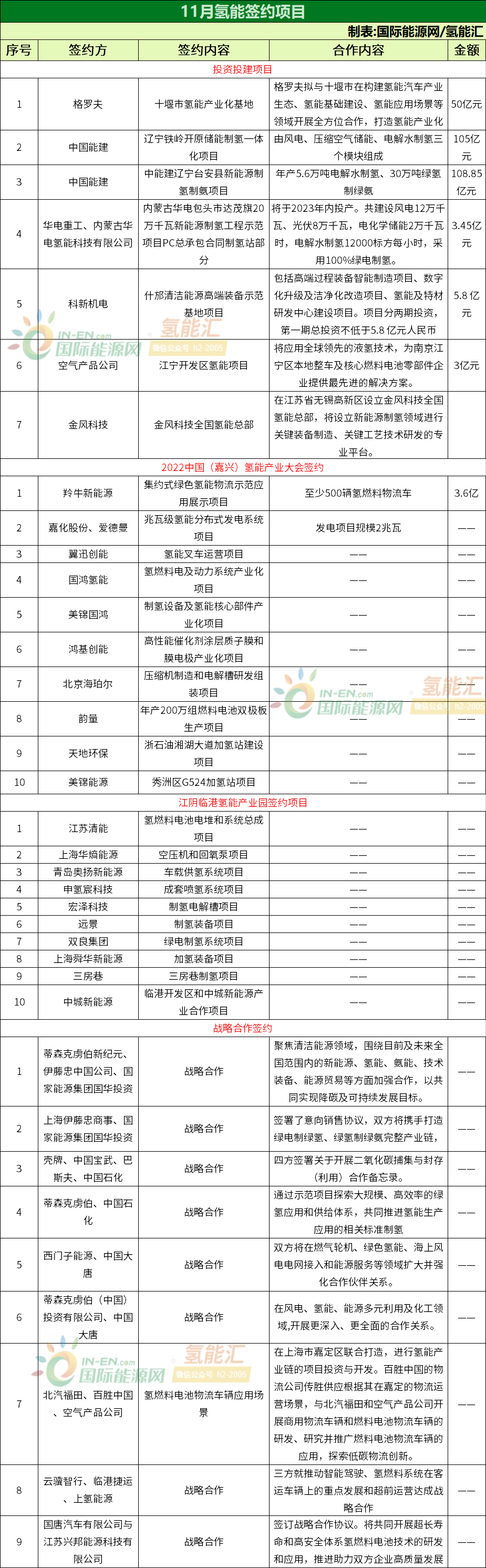 簽約項目多,最大的原因是11月氫能領域活動多,發(fā)生了三起集中簽約活動。11月23日,在嘉興舉行了2022年中國氫能產(chǎn)業(yè)大會,會上10個項目得到簽約。11月7日,江陰臨港氫能產(chǎn)業(yè)園開幕之際,超10個項目獲得簽約。另外,11月5日進博會召開之際,氫能項目的簽約也成為重頭戲。氫能作為零碳能源的最根本體現(xiàn),成為中外大型能源合作項目的重點內(nèi)容。中國石化、國家能源集團、蒂森克虜伯、西門子能源等中國能源大鱷紛紛簽署戰(zhàn)略合作協(xié)議。