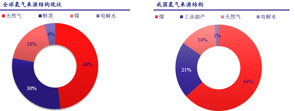目前,全球制氫技術的主流選擇是化石能源制氫,主要是由于化石能源制氫的成本較低 ,其中天然氣重整制氫由于清潔性好、效率高、成本相對較低,占到全球 48% 。我國能源結構的特點是“富煤少氣”,煤制氫成本要低于天然氣制氫,因而國內煤制氫占比最大(64%),其次為工業副產(21%)。