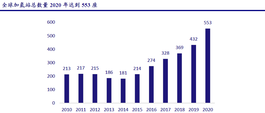 自2014年以來,全球加氫站的數量不斷增長,到 2020年底達到了553站。