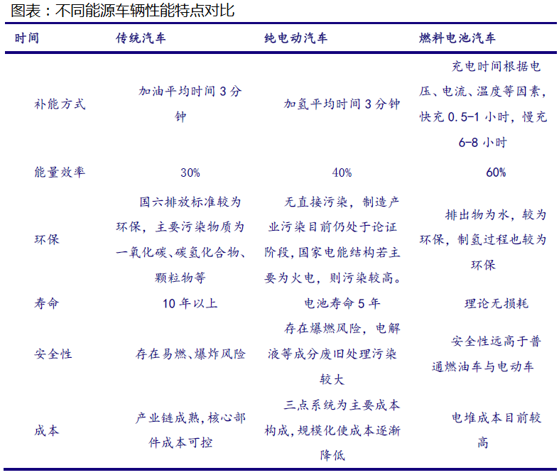 氫能源熱值高,約為石油的三倍以上,是理想的化石燃料替代品。氫能源燃燒使用后不產生任何有害或溫室氣體,對我國實現“碳達峰”、“碳中和”等目標具有重要意義。相比于傳統汽車,氫能源汽車使用氫燃料電池作為動力來源,具有能量轉換效率高和完全無污染的優點。相比于鋰電池電動車,氫能源汽車除了不受溫度影響、續航里程更長以外,還具有能迅速補充燃料(3~5分鐘)的優點。
