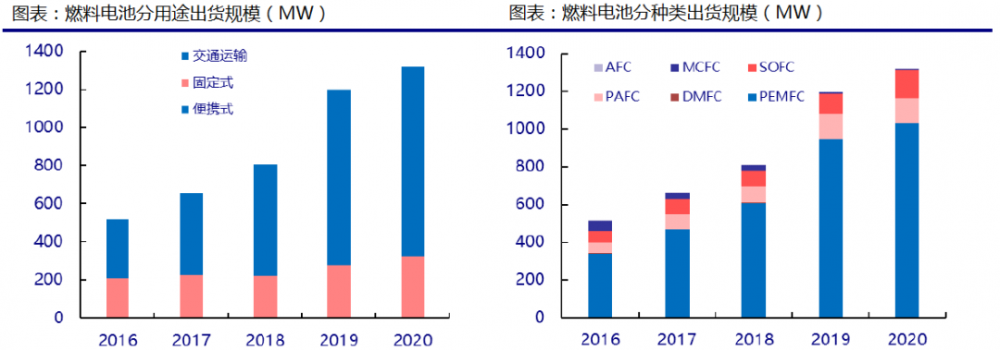 全球燃料電池市場潛力大,其中交通運輸類燃料電池將成為增長主力。根據 E4tech發布的 2020 燃料電池產業回顧, 2020 年全球燃料電池出貨量 1318.7MW 市場規模 42 億美元 。按用途劃分,交通運輸類出貨量 993.5MW ,占比 75.3%;按種類劃分, PEMFC 出貨量 1029.7MW ,占比 78.1%。長期來看,燃料電池汽車仍將是燃料電池市場的增長主力。據預測, 2020-2025 年全球燃料電池市場 年復合增長16.64%, 2025 年將達到 90.5 億美元。