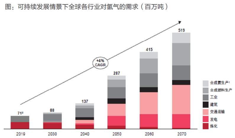 根據國際能源署預測,到 2070 年,全球對氫氣的需求預計將從 2019 年的 7000 萬噸增長 7 倍達 5.2 億噸。隨著化石燃料燃料的減少,疊加氫氣低碳化生產因素,全球能源行業和工業加工領域有望在 2070 年實現碳中和。