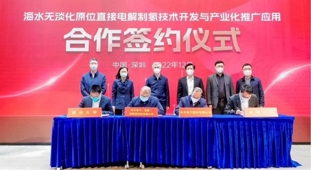 中國經濟導報、中國發展網訊 倪珺 12月16日,深圳大學/四川大學謝和平院士團隊與東方電氣股份有限公司、東方電氣(福建)創新研究院有限公司簽署“海水無淡化原位直接電解制氫原創技術中試和產業化推廣應用”的四方合作協議。