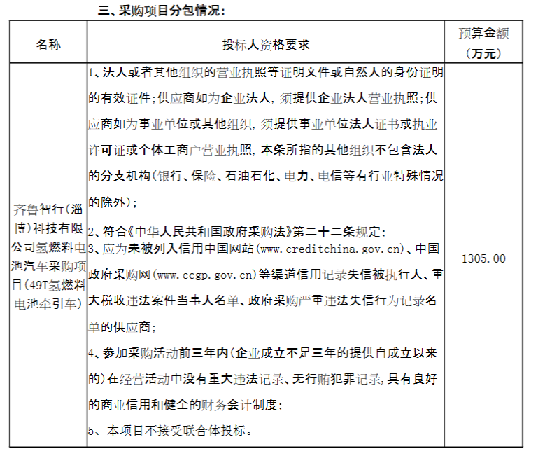 近日,齊魯智行(淄博)科技有限公司發布氫燃料電池汽車采購項目(49T氫燃料電池牽引車)招標公告,該項目不允許聯合體投標,預