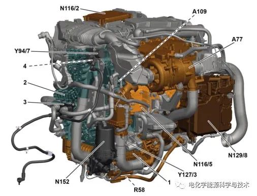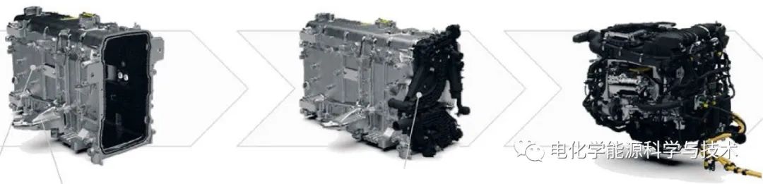介質(zhì)分配板(中圖),介質(zhì)分配板是燃料電池堆處用于空氣和氫氣以及高溫冷卻液的界面。氫循環(huán)路完全集成到燃料電池堆外殼的介質(zhì)分配板上。通過(guò)被動(dòng)引射器系統(tǒng)實(shí)現(xiàn)氫氣的再循環(huán)。所有其他輔助部件,如空壓機(jī)和DC/DC轉(zhuǎn)換器,可以隨后安裝到框架外殼上。