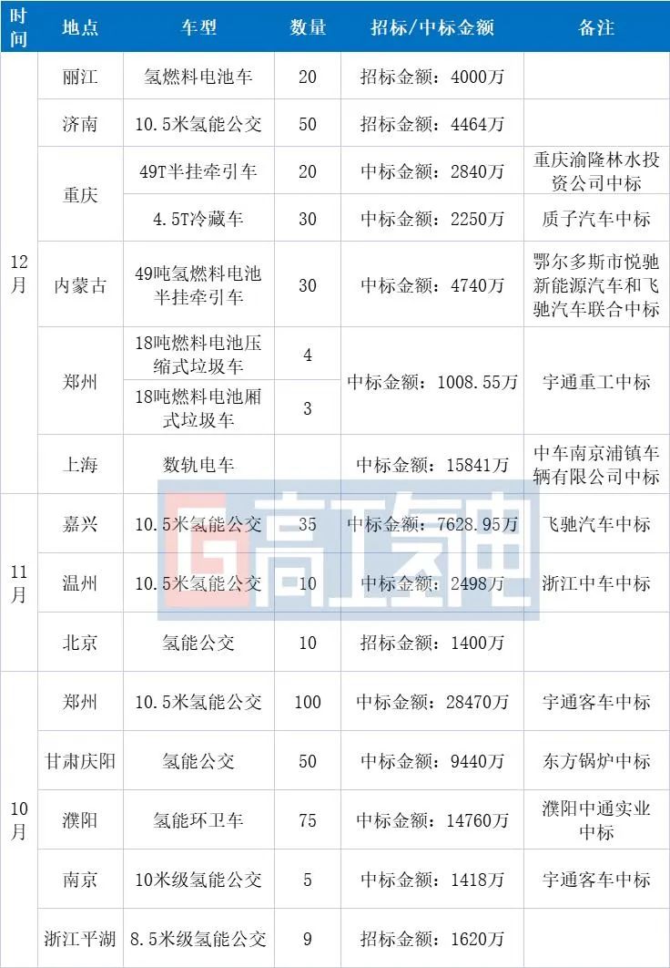 今年第四季度氫車大單都花落誰家?以下是高工氫電梳理出的第四季度氫車招中標概況,以及超10家燃料電池企業配套氫車交付投運概況(備注:根據公開信息整理,存在遺漏可能):