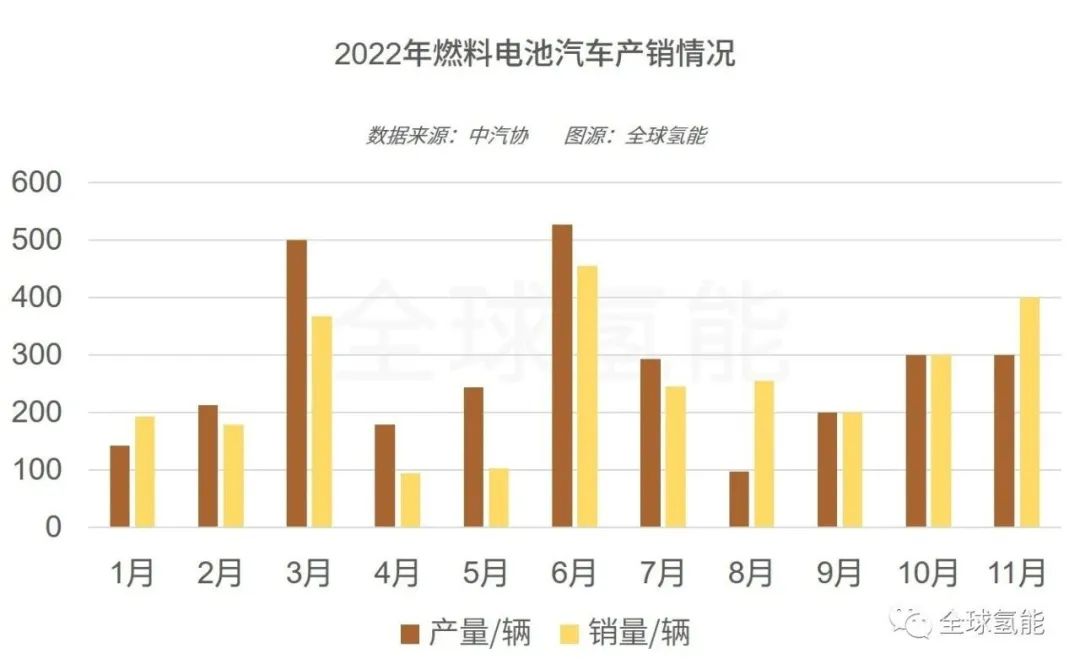 2022年1-11月燃料電池汽車產(chǎn)銷情況,圖源全球氫能