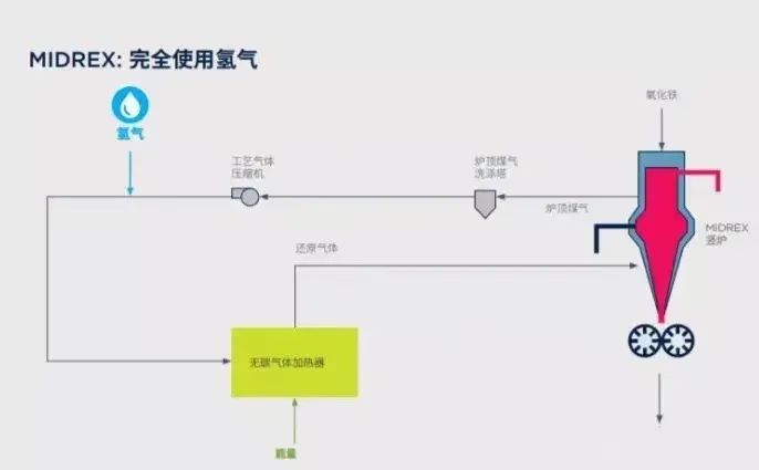 基本思路:在高爐生產過程中用氫氣取代傳統工藝的煤和焦炭(氫氣由清潔能源發電產生的電力電解水產生),氫氣在較低的溫度下對球團礦進行直接還原,產生海綿鐵(直接還原鐵),并從爐頂排出水蒸氣和多余的氫氣,水蒸氣在冷凝和洗滌后實現循環使用。