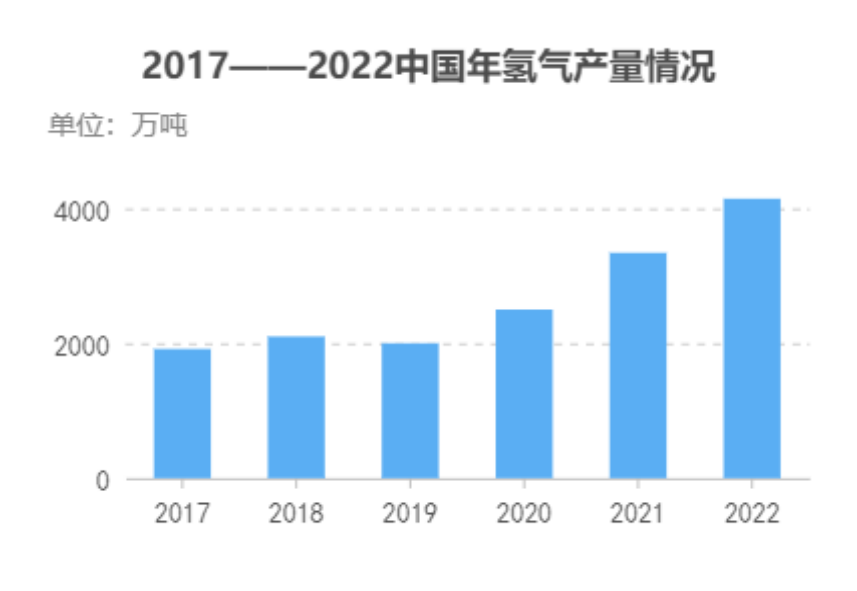 反觀中國國內,在2019年以前,氫能產業發展還處于萌芽階段,產業創新能力、技術裝備水平、支撐產業發展的法律法規及基礎性制度規范、產業發展形態與路徑等仍需進一步探索與嘗試。2019年是轉折之年,中國氫氣產量突破2000萬噸,成為世界第一產氫大國。2019年3月,氫能首次被寫進《政府工作報告》,要求“推進充電、加氫等設施建設”,無疑是平靜的水面出現了一點波瀾并迅速擴散,由此引發資本市場關注。作為氫氣制備生產工業雄厚的中國,2020年——2022年氫氣年產量平均增速超20%,穩居氫氣產量第一大國寶座。