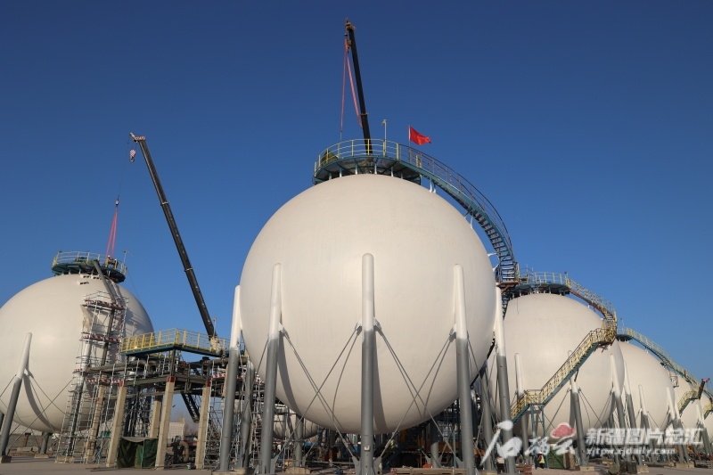 項目目前已完成了土建基礎施工,動靜設備全部安裝就位,項目工藝管道焊接完成96.21%,水電解制氫裝置主要設備全部吊裝就位,10臺氫氣球罐建造完成。