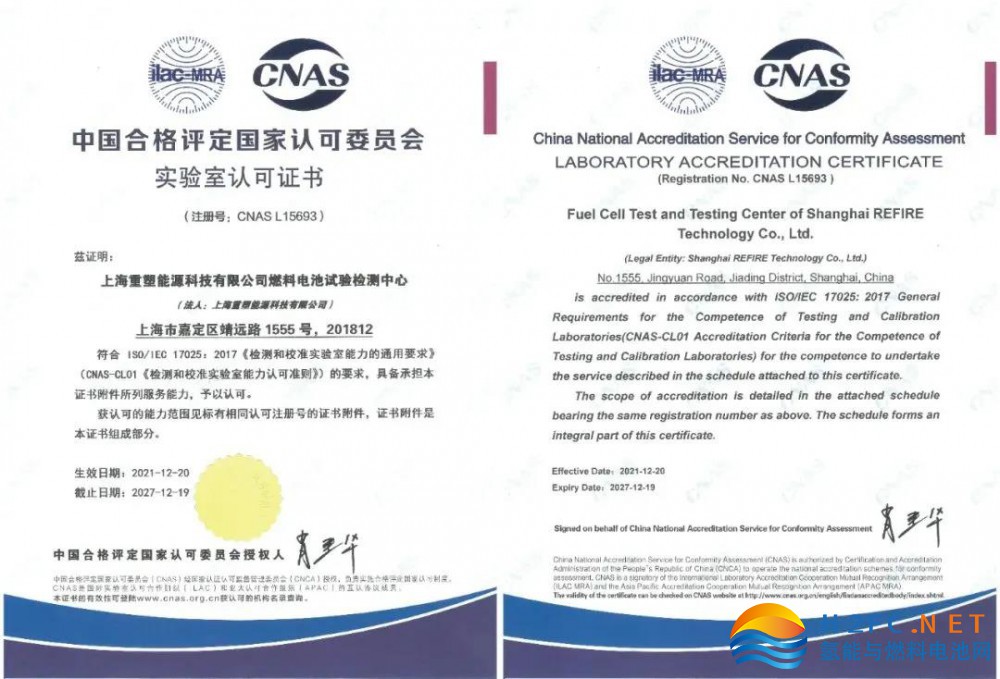 2021年12月20日,重塑科技燃料電池試驗檢測中心獲得中國合格評定國家認可委員會(CNAS)頒發的實驗室認可證書(注冊號CNAS L 15693)。該檢測中心形成了從關鍵零部件到車載動力系統及功能樣車的全套開發、測試、試制與驗證能力,以支持未來全系列產品的開發和更大規模的市場。