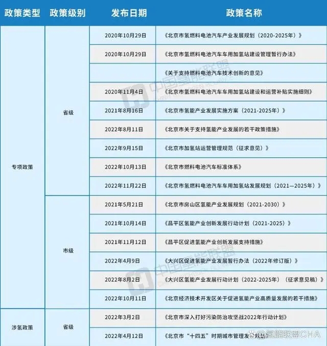 政策方面,截至目前,北京市已出臺(tái)省市級(jí)氫能專項(xiàng)政策共14項(xiàng),其中省級(jí)9項(xiàng),包含發(fā)展規(guī)劃、實(shí)施方案、支持措施、管理規(guī)范等各個(gè)方面,市級(jí)5項(xiàng);此外,北京市相關(guān)非氫能專項(xiàng)政策也涉及氫能發(fā)展。