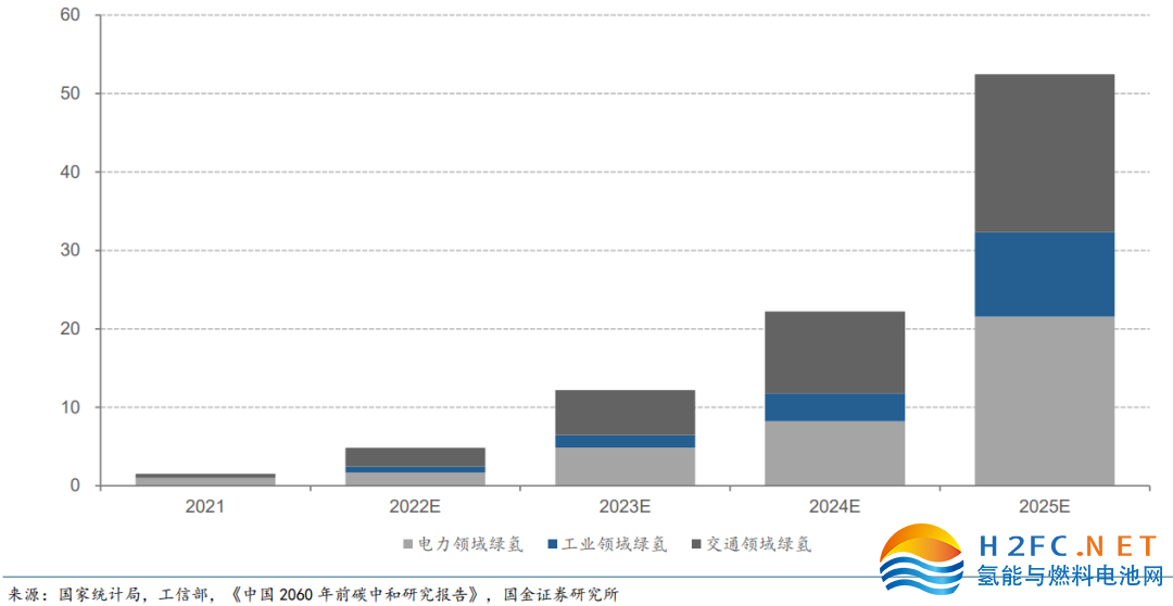 2025年交通、工業、儲能領域電解制氫需求量共超50萬噸,電解槽裝機累計需求超15GW,累計市場規模超310億元。