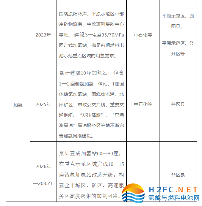 推動重點區域加氫建設布局,探索新型加氫站應用示范,實現“車站聯動”運營。發揮基礎設施建設的引領作用,適度超前布局加氫基礎設施。優先圍繞平原示范區冷鏈物流中心、經濟技術開發區中歐班列集散中心等地,開展35/70MPa加氫站建設,逐步完善重點示范區域、“鄭汴洛濮”、“京港澳高速”高速服務區等地的加氫網絡布局,加快推進制氫加氫一體站、固體儲氫加氫站等新型加氫站的示范應用。至2025年,全市氫燃料電池汽車運營規模達到500輛,建成加氫站10座。