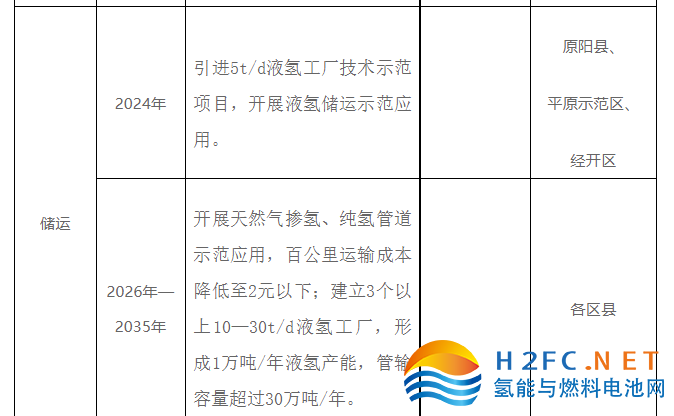 推動液氫儲運技術規?;瘧茫剿餍滦蜌淠軆\模式,具備中遠距離跨省市調度能力。圍繞“風光氫儲”大基地,開展規?;簹鋺猛茝V,通過液氫運輸,覆蓋豫北、豫中乃至全省交通領域用氫需求。試點示范天然氣摻氫、純氫管道,大幅度降低運輸成本,連接制氫基地和重點化工園區、工業園區,推動工業原料和燃料可再生氫替代。到2035年,建立3個以上10—30t/d液氫工廠,形成1萬噸/年液氫產能,管輸容量超過30萬噸/年。