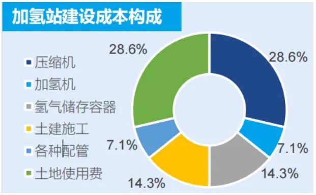 加氫站建設的核心裝備包括氫氣壓縮機、氫氣儲存容器(儲氫瓶組/儲氫罐)與加氫系統,集成設備合計占建設成本的50%,其中壓縮機占比最高達到近30%,氫氣儲存容器為14.3%,加氫機占比7.1%。