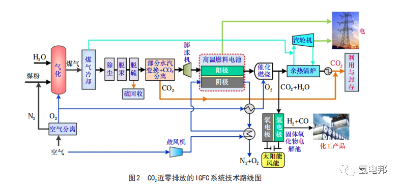 隨著我國能源形勢日益嚴(yán)峻及環(huán)保壓力持續(xù)加大,對降低CO2排放、實現(xiàn)煤炭資源清潔高效利用的需求越來越迫切 [13],煤炭清潔高效利用技術(shù)創(chuàng)新是我國《能源技術(shù)革命創(chuàng)新行動計劃(2016—2030年)》的重要內(nèi)容。在整體煤氣化聯(lián)合循環(huán)發(fā)電的基礎(chǔ)上發(fā)展的煤氣化燃料電池發(fā)電技術(shù),可實現(xiàn)煤基發(fā)電由單純熱力循環(huán)發(fā)電向電化學(xué)和熱力循環(huán)復(fù)合發(fā)電的技術(shù)跨越,大幅提高煤電效率,在高效發(fā)電的同時實現(xiàn)污染物近零排放和負(fù)荷快速響應(yīng),被視作未來最有發(fā)展前景的近零排放煤氣化發(fā)電技術(shù)。國家《“十三五”國家科技創(chuàng)新規(guī)劃》和《能源技術(shù)革命創(chuàng)新行動計劃(2016—2030年)》等都將IGCC/IGFC列為重要內(nèi)容和發(fā)展目標(biāo)。2017年,我國啟動了面向2030年重大科技項目,其中明確要求完成基于IGFC發(fā)電關(guān)鍵技術(shù)研發(fā)和工程示范。