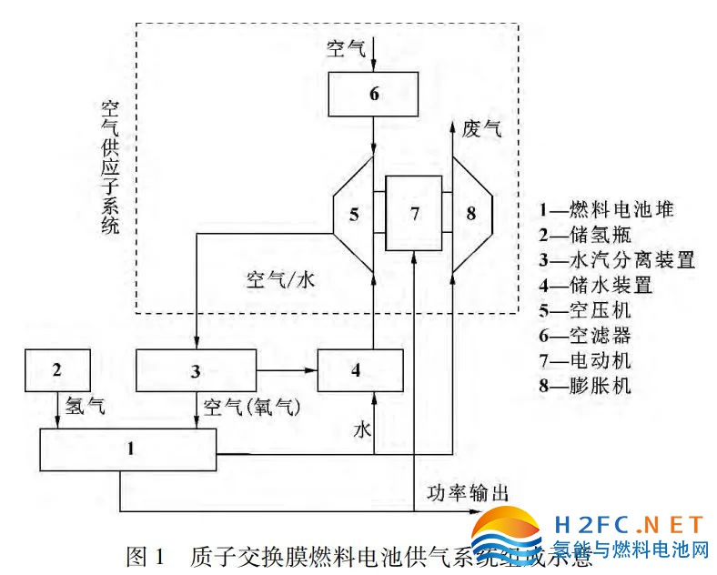 在質(zhì)子交換膜燃料電池系統(tǒng)中,供氣壓力約為 3×105 Pa,流量為 100——300 kg /h,反應(yīng)產(chǎn)物主要是水; 燃料電池堆出口氣體溫度為80—— 100 ℃,壓力為 2.8×105 Pa,這部分排出廢氣還具有較高的可回收能量。為提高燃料電池效率,需用膨脹機(jī)來(lái)減少壓縮機(jī)的能量消耗。壓縮機(jī)所能耗占附件總能耗的 95% 左右,所以降低附件能耗關(guān)鍵是提高供氣系統(tǒng)的效率,采用膨脹機(jī)回收排放廢氣能量是一種有效方式