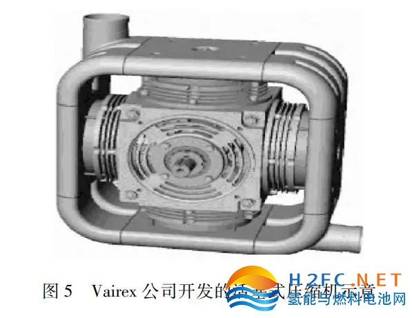 美國(guó) DOE 和 Author D. Little 公司合作開發(fā)了兩代渦旋式空壓機(jī)和膨脹機(jī)樣機(jī)。第一代用于 28 kW 燃料電池,供氣流量為42 g /s,壓力可達(dá) 2. 2×105 Pa。第二代空壓機(jī)轉(zhuǎn)速和流量都提升了,可滿足 50 kW 燃料電池工作需求。