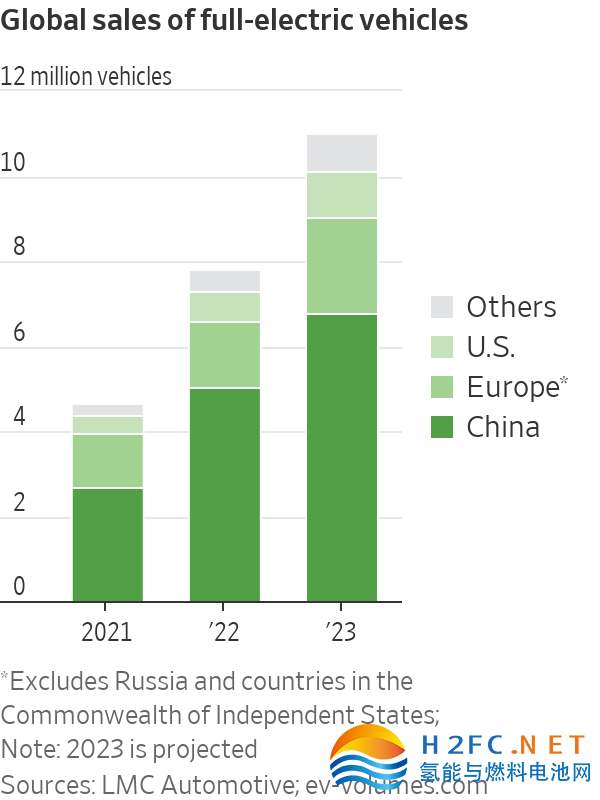 最新數據和估算顯示,在中國和歐洲強勁增長的推動下,2022年電動汽車銷量跨過了一個全球里程碑,首次達到新車銷量約10%的市場份額,高于2021年的8.3%。LMC Automotive和EV-Volumes提供的數據顯示,2022年全球電動汽車銷量總計約780萬輛,同比增長68%。而2022年全球新車總銷量8060萬輛,同比下降約1%。