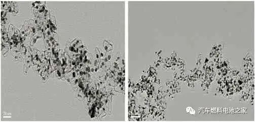 圖2 中,顆粒最亮的為碳黑,黑色物質(zhì)為鉑;由圖可知,催化劑中活性組分鉑顆粒大小為4.5 nm,在載體上分布較均勻。