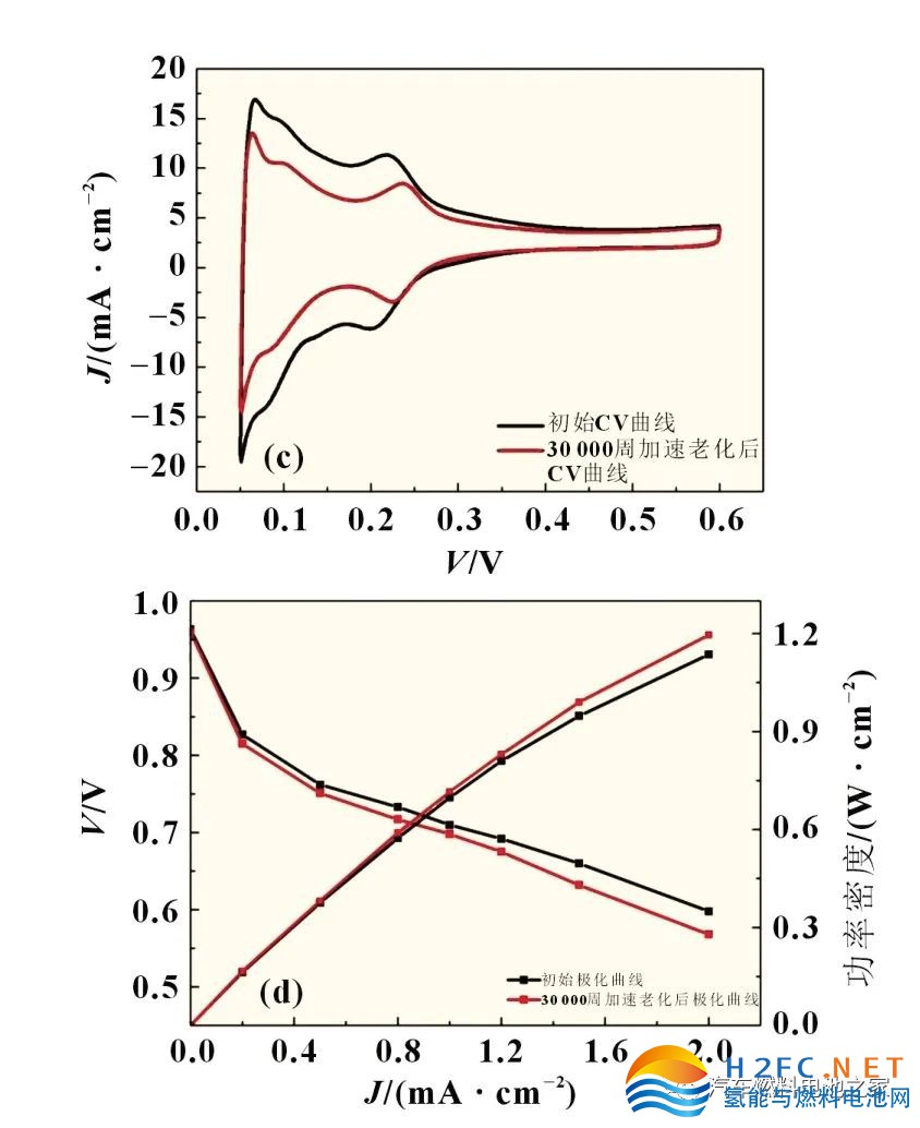 圖5 (a)MEA 經(jīng)載體加速老化5 000周前后CV 曲線對比;(b)MEA 經(jīng)載體加速老化5 000周前后極化曲線對比;(c)MEA經(jīng)催化劑加速老化30 000周前后CV曲線對比;(d)MEA經(jīng)催化劑加速老化30 000周前后極化曲線對比